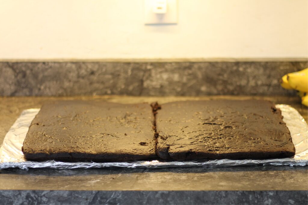 Pour 1050g of mixture into each of the 4 parchment lined baking sheets that measure 16×12” by 1 inch tall.