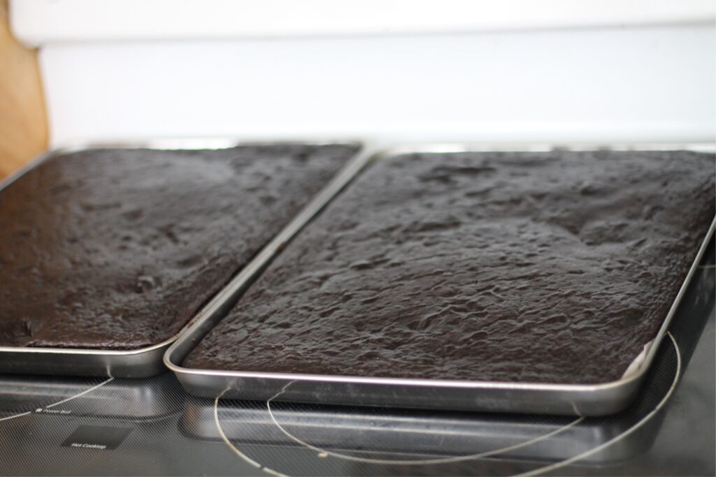 Next, line four 16×12-inch baking sheets (each 1 inch deep) with parchment paper. This will prevent the cake from sticking and make removal easier. -