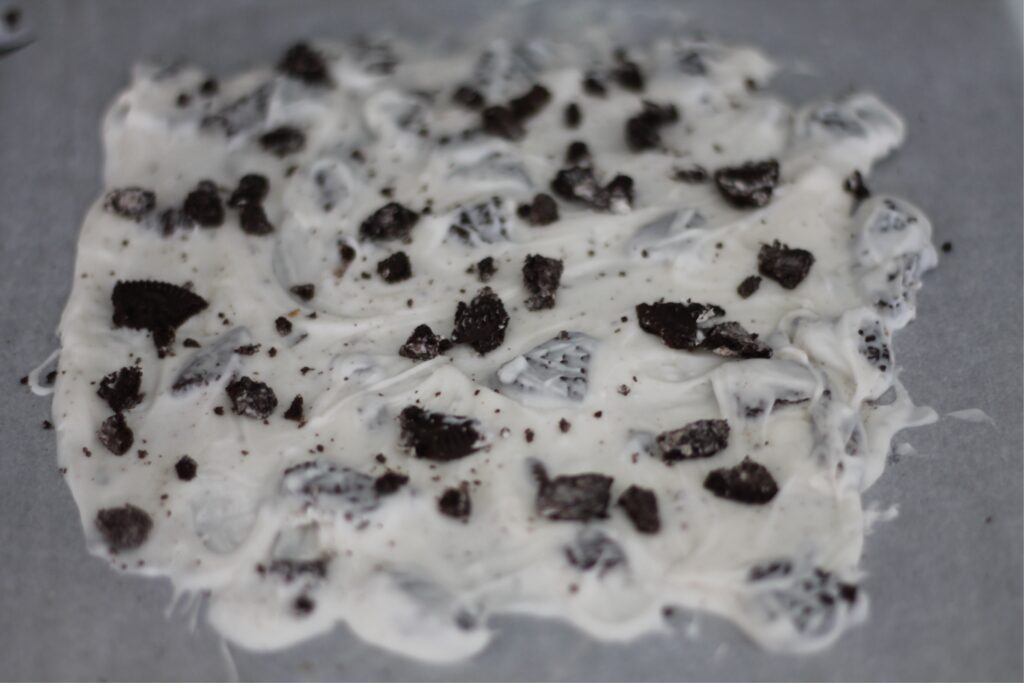 - Add the Oreo Chunks: Evenly distribute the broken Oreo pieces over the white chocolate.