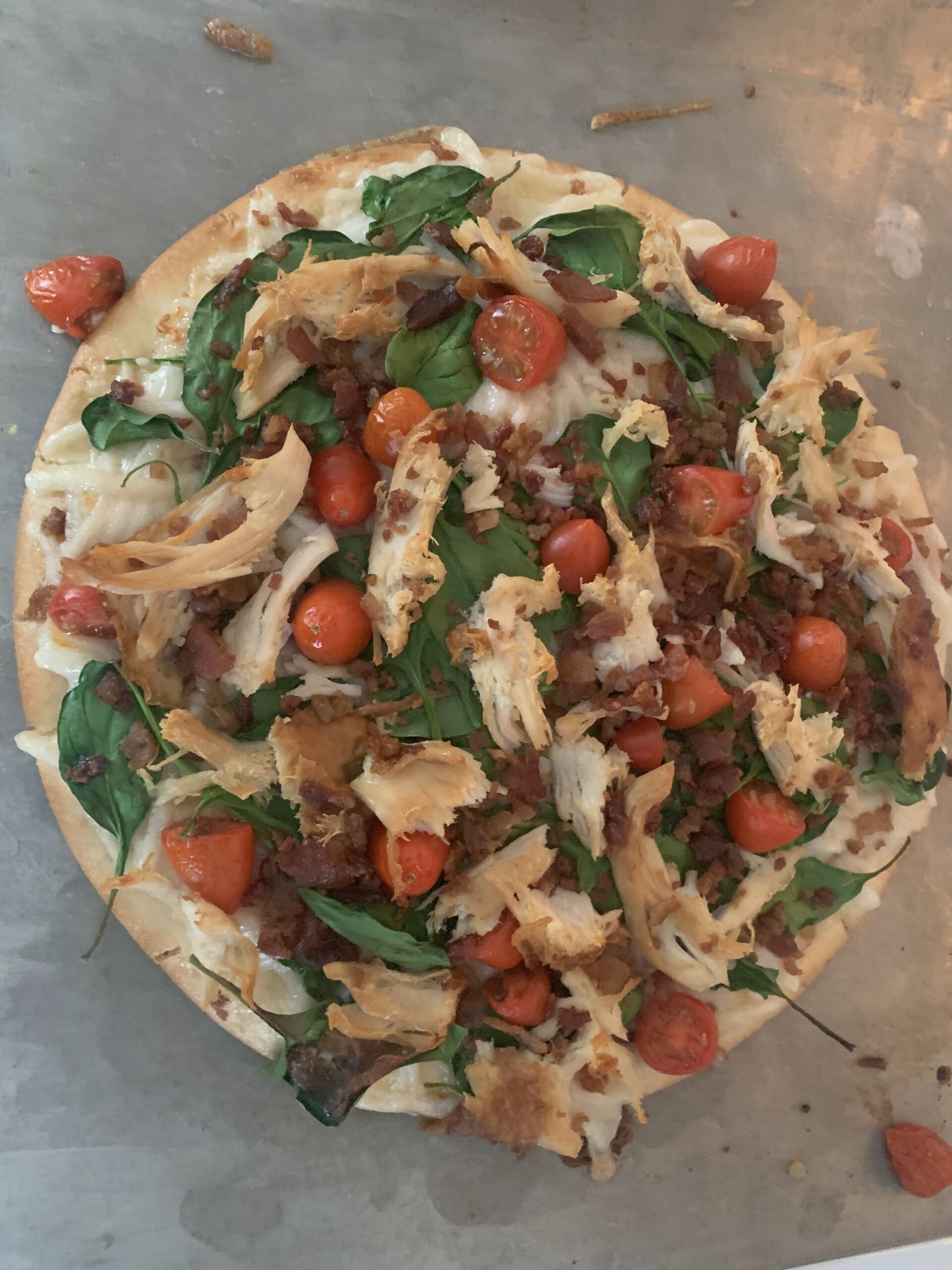- Add spinach, then bacon, tomatoes, and lastly chicken to the top.